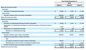 • The text explains that net income per share of Class A, Class B, and Class C stock is computed using the
