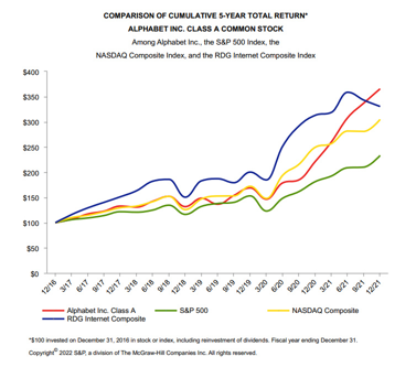 graph (2017-2022) shows the Alphabet's Class A share underperforming RDG Internet Composite but outperforming
