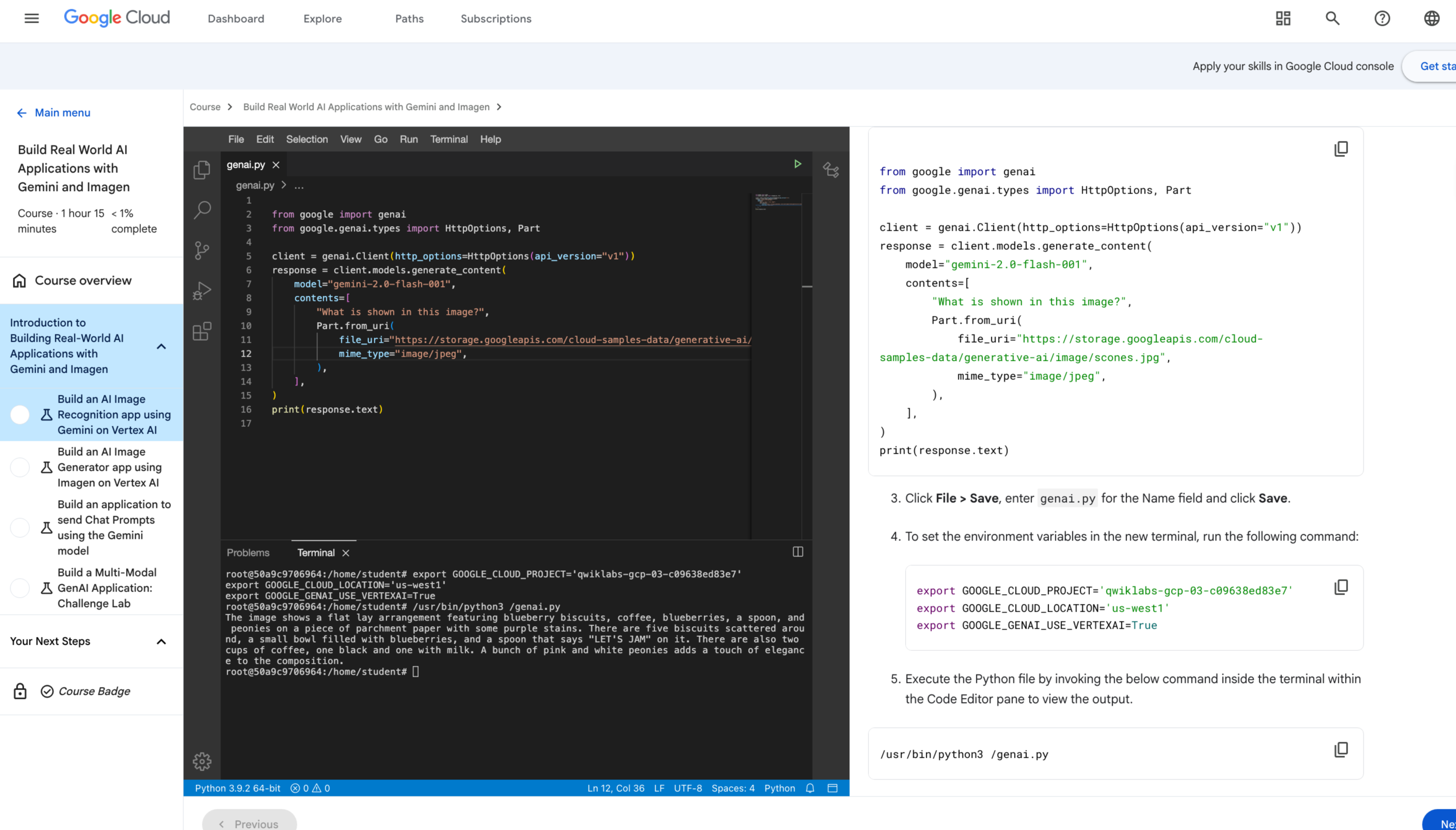 이 실습에서는 Google의 Vertex AI SDK를 사용하여 강력한 Gemini 생성형 AI 모델과 상호작용하는 방법을 알아봅니다. 이를 통해 이미지에 대해 질문하고 유용한 텍스트 기반 대답을 받을 수 있습니다.